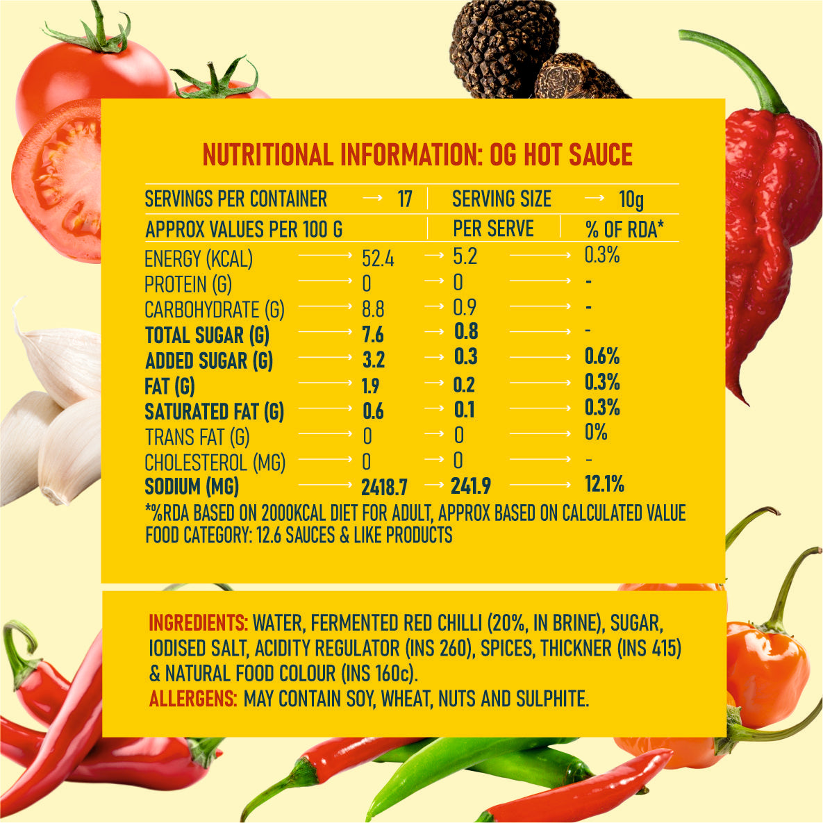 HOTCHAA! OG Hot Sauce is a light, bold, flavorful blend of fermented chillies with a sharp, spicy kick and fruity chipotle notes, perfect for spicing up any meal. Crafted in small batches with no oil, no MSG, and vegan-friendly ingredients, it’s your go-to for pasta, paratha, eggs, pizza, meats, or even a Bloody Mary. Packaged in a light, easy-to-squeeze bottle, it’s all about effortless spice control. Add a zing of OG magic to every bite!